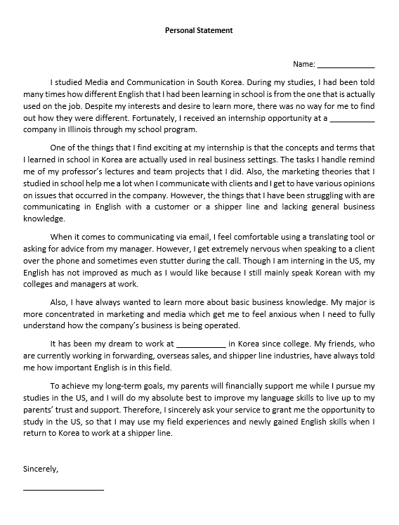 4. Statement Letter or 귀국 보증 - 미국에서 학교를 마치고 본국으로 돌아갈 것임을 어필해야합니다. 가족이 모두 본국에 있다거나, 본국에 비지니스나 재산이 있다거나 하는 것들을 증거로 제출하거나 혹은 해당 미국 학교에서 공부하고 본국에서의 커리어에 어떤 방식으로 도움이 될 것인지 작성합니다. 정해진 Form이 있는 건 아닙니다.